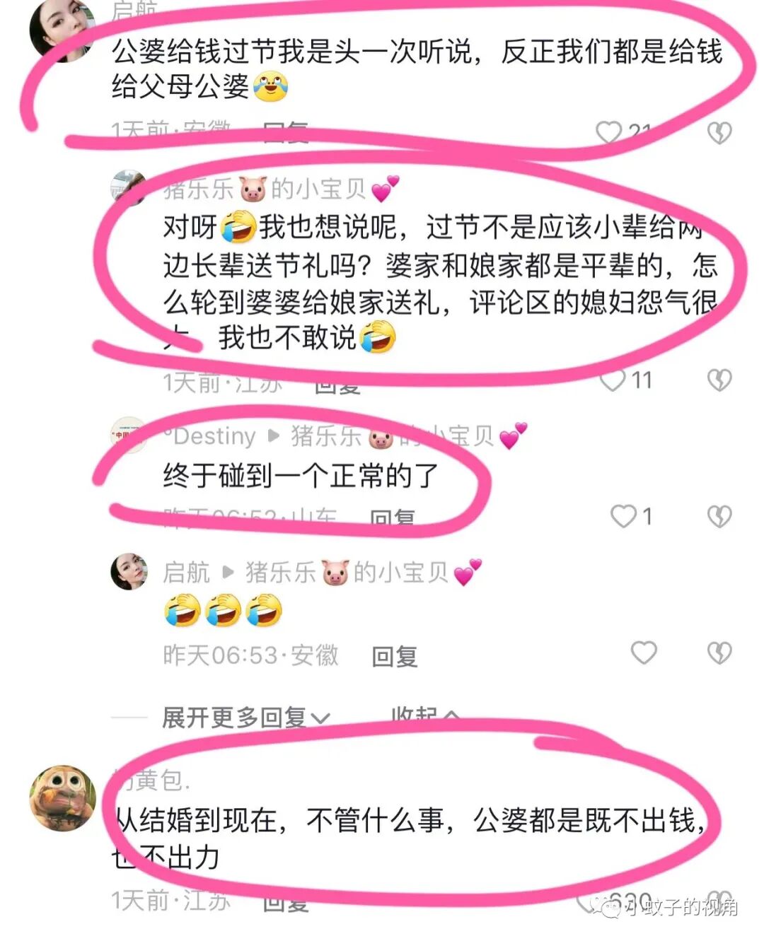 面对众多网友的埋怨,一位网友说:公婆给钱过节我还是头一次听说,反正我们都是给父母和公婆,而不是他们给我们。