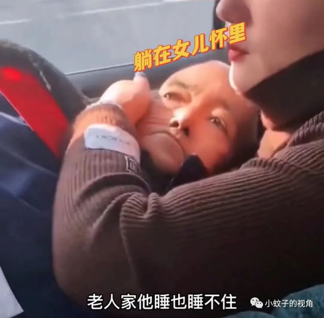 没办法,女儿为了让父亲舒服一点,就把父亲抱在怀里。就像小时候父亲抱着她一样,给父亲一点安慰,让他少一点难受,多一点踏实。