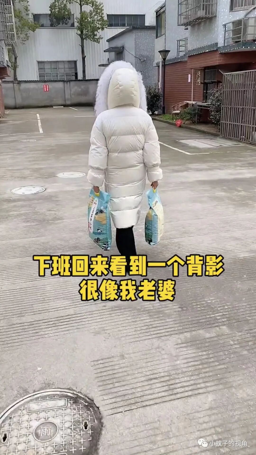 在回家的路上突然看到前面走着一个人,从背景和衣服来看,都非常像自己的老婆,这个女人正手里拎着两包大米,步履蹒跚地往前走。