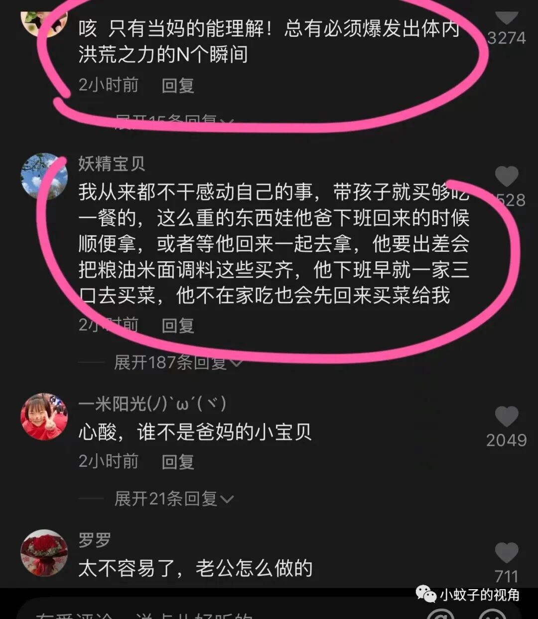 也有网友说:我从来都不干感动自己的事,带孩子就买够吃一餐的,这么重的东西娃他爸下班回来的时候顺便拿,或者等他回来一起去拿。他要出差会把粮、米、面、调料这些买齐。他下班早就一家三口出去买菜,他不在家吃也会先回来买菜给我。