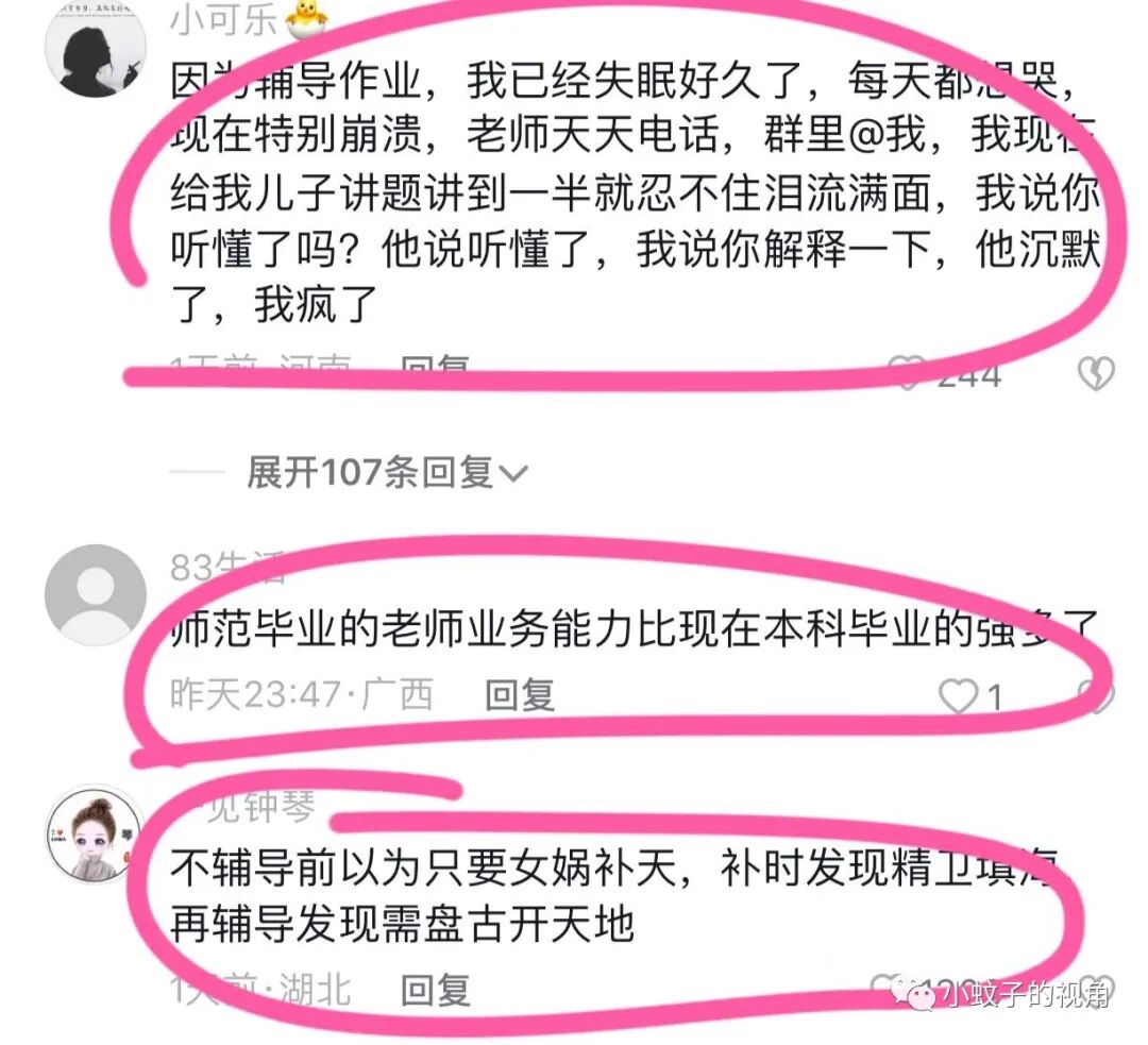 还有网友现身说法:因为辅导作业,我已经失眠好久了,每天都想哭,现在特别崩溃。老师天天打电话,在群里@我。