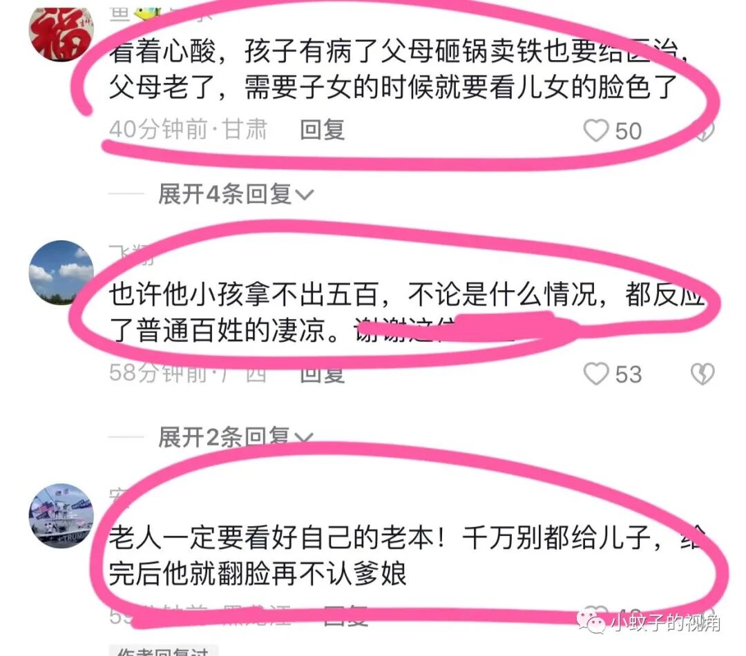 还有网友说:老人一定要看好自己的老本,千万别都给儿子。给完后他就翻脸不认爹娘了!