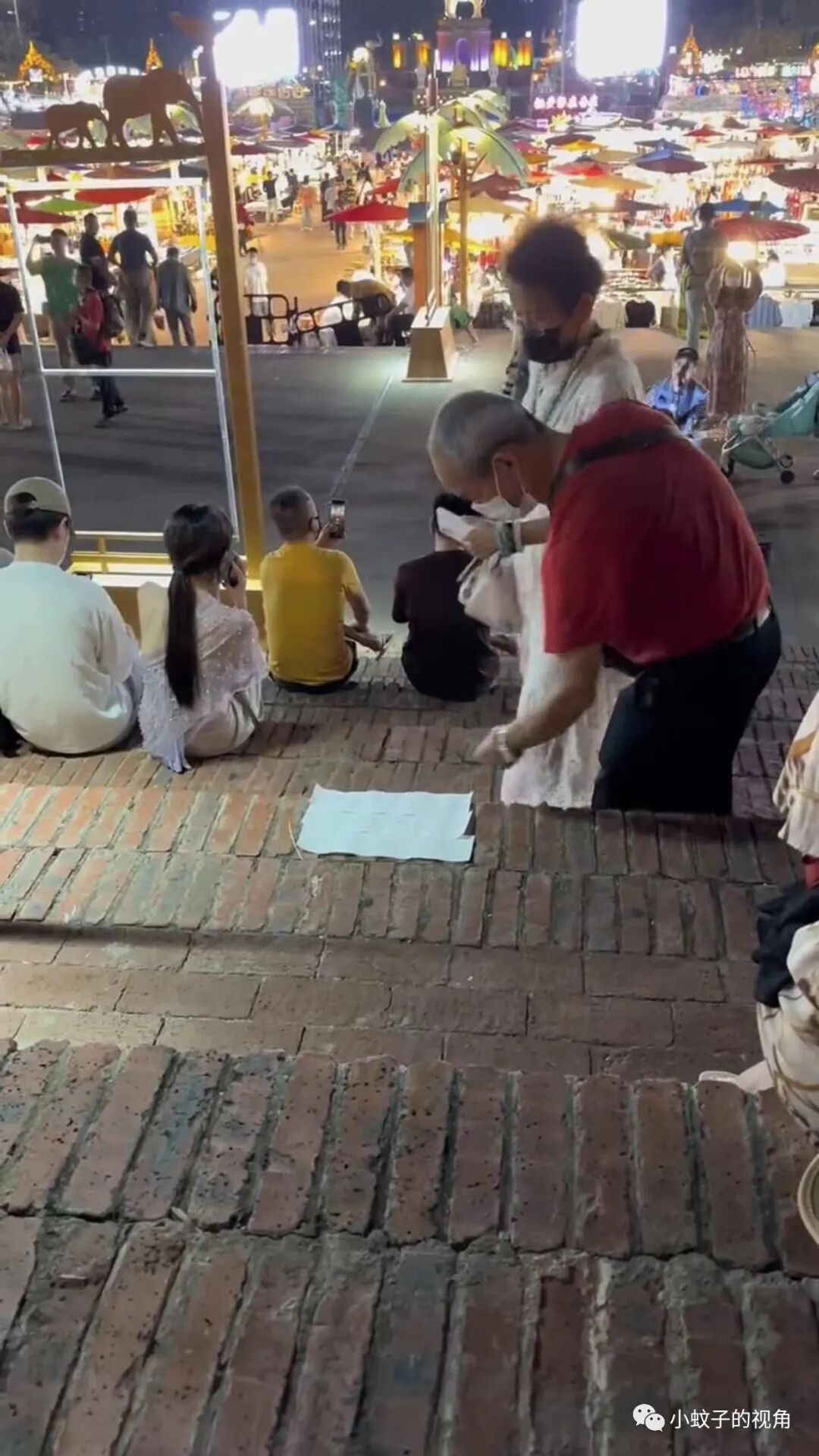 过了一会了,大爷可能是累了,从口袋里掏出纸巾,认真地铺在台阶上。