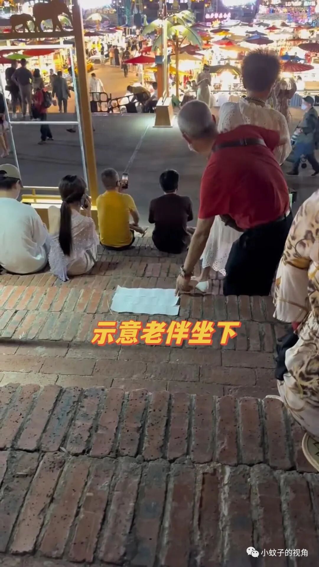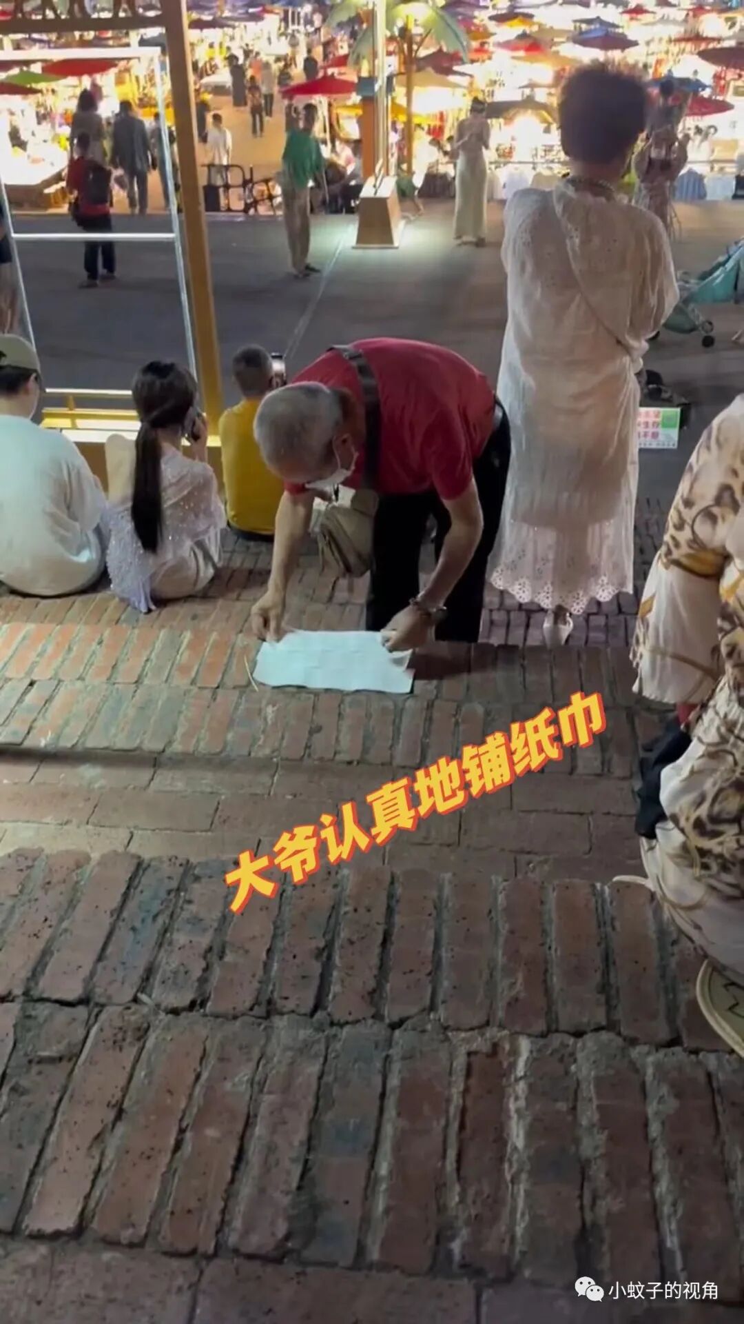 却没想到,大爷认真地铺了三张纸巾后,并没有坐下来,而是拍拍前面正在看表演的老伴,示意老伴坐在纸巾上。
