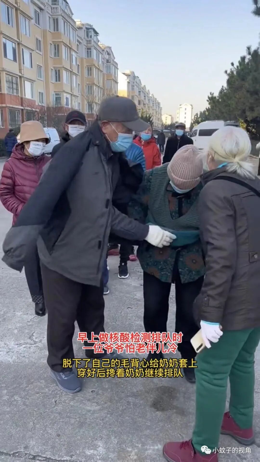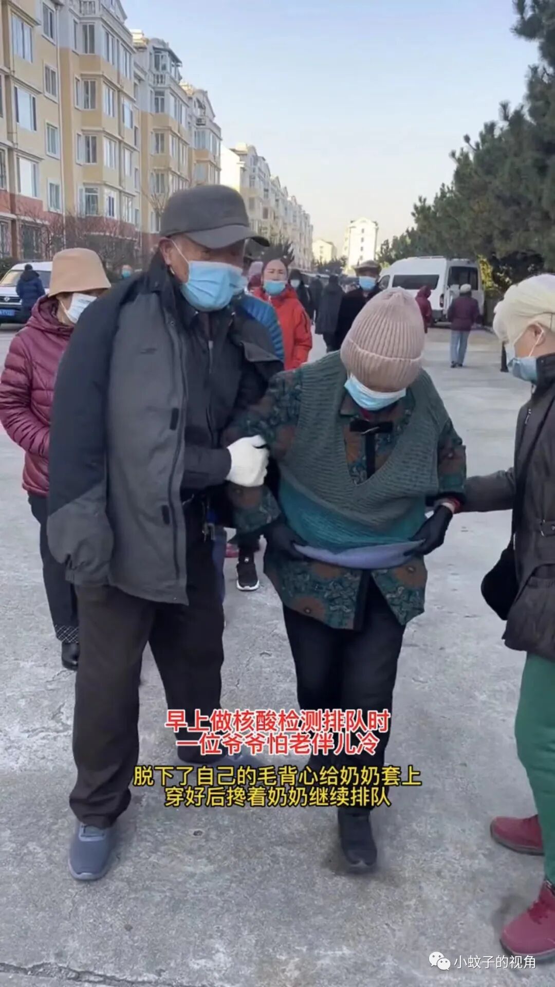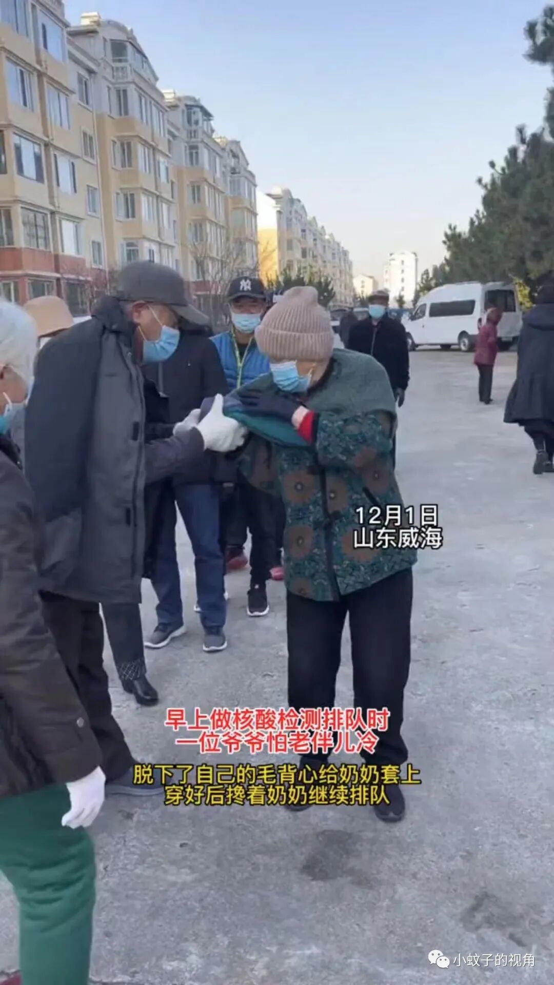 就像山东威海的这对夫妻一样,老人早起排队做核酸,老太太嫌天气冷,老头的做法引起众人围观。