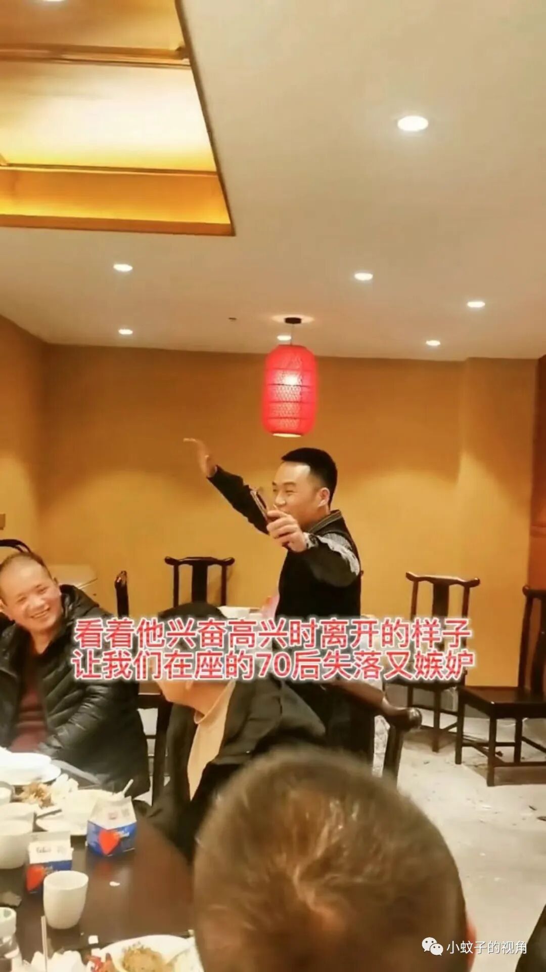 男子脸上笑出了一朵花,一边给妻子打电话一边兴奋地跳着舞,看着他得瑟地离开,这一桌人都羡慕不已。