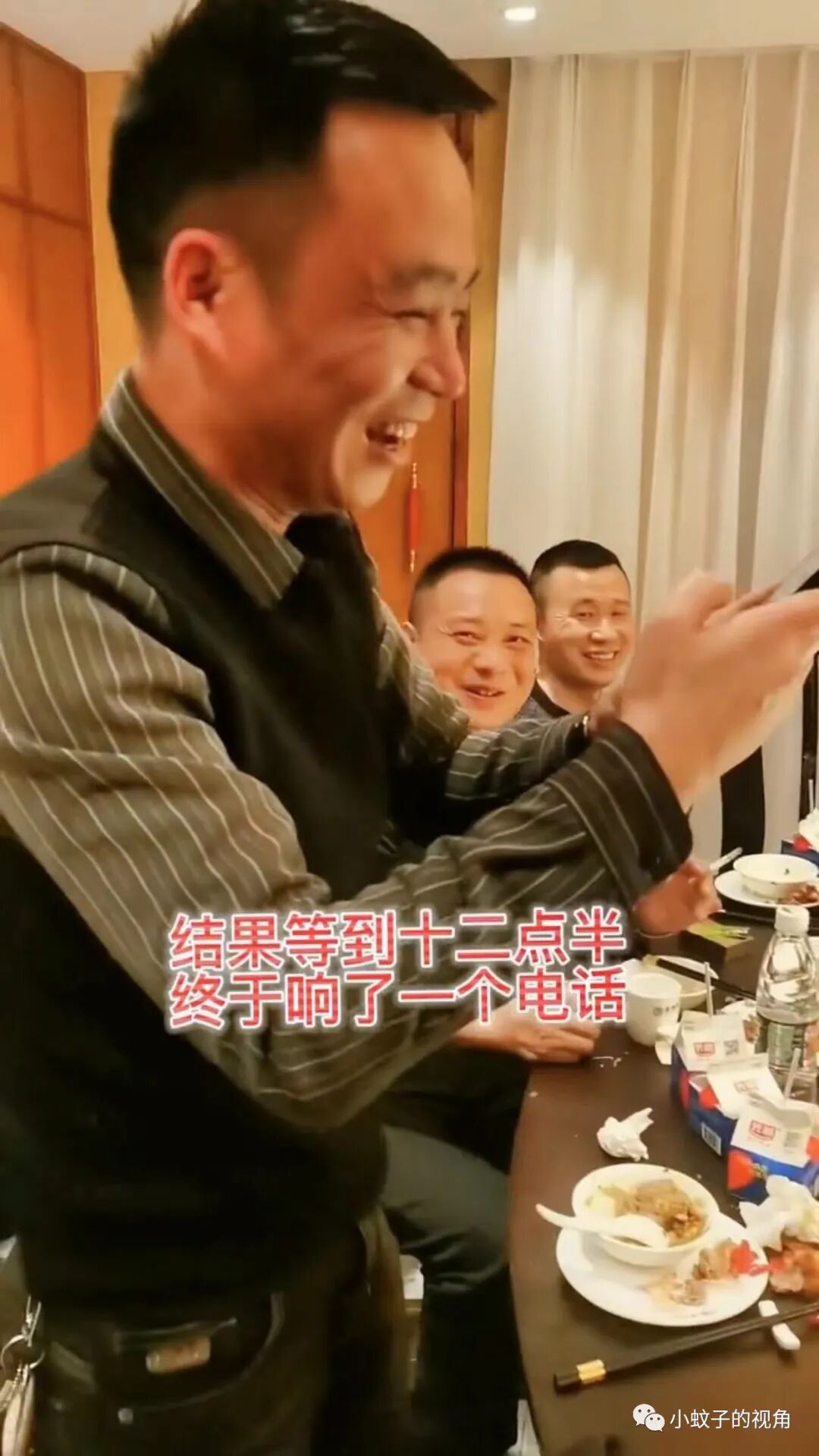 然而,一直到半夜十二点都没有一个电话响起,一群人满脸尴尬。知道十二点半的时候,终于有一个人的手机响了,妻子问他怎么还没吃完?