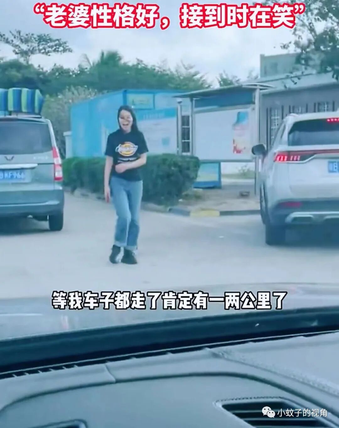 男子表示:没事,她脾气好。等我接到她的时候,她看着我们返回的车子还在大笑。