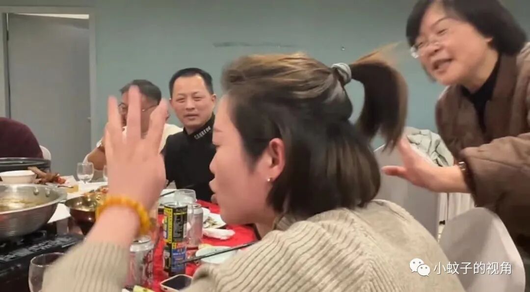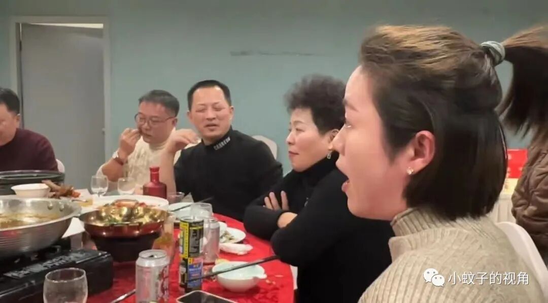 据这位女子解释,坐在餐桌前舌战群儒的这位女子是她姐姐,由于年纪大了一直找不到合适的对象,每年回家过年都会被一群人催婚。