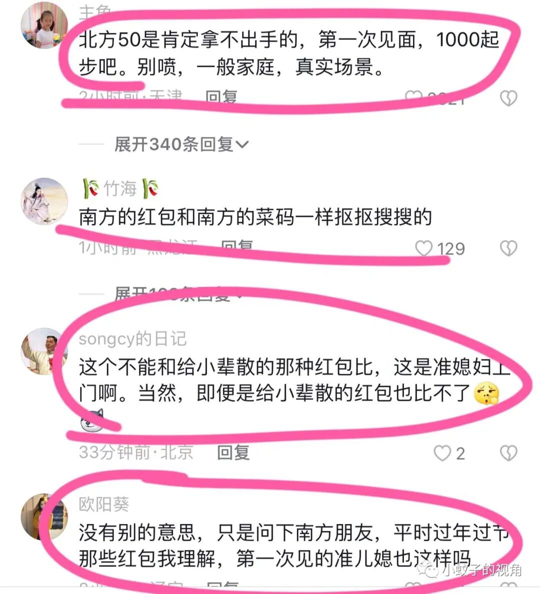 还有网友说:可能是双方地区的风俗习惯不同。我想问一下南方的朋友,平时过年过节这些红包我能理解,第一次见准媳妇也是这样吗?