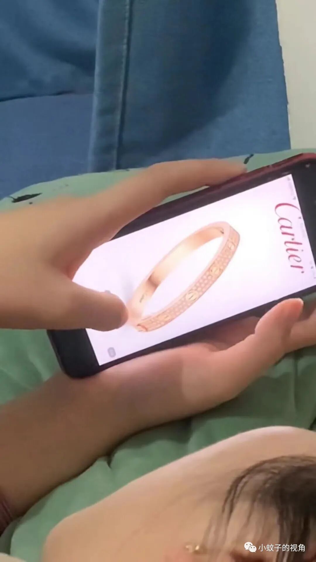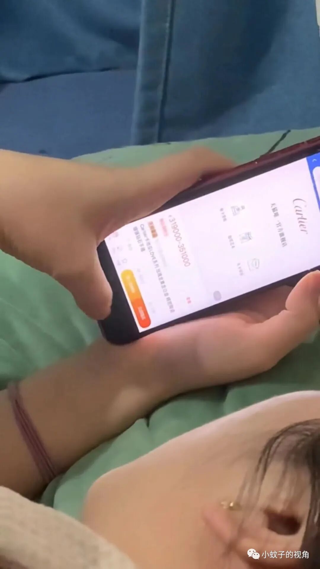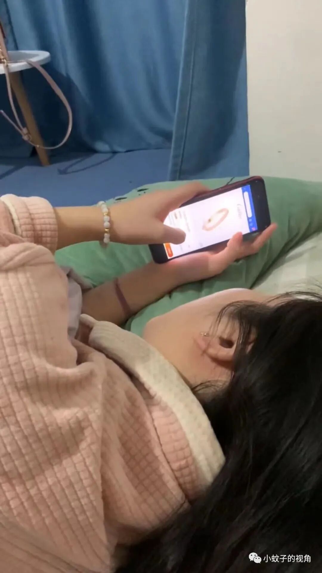 妻子躺在床上正在看一个手镯,手镯的价格竟然有30多万!