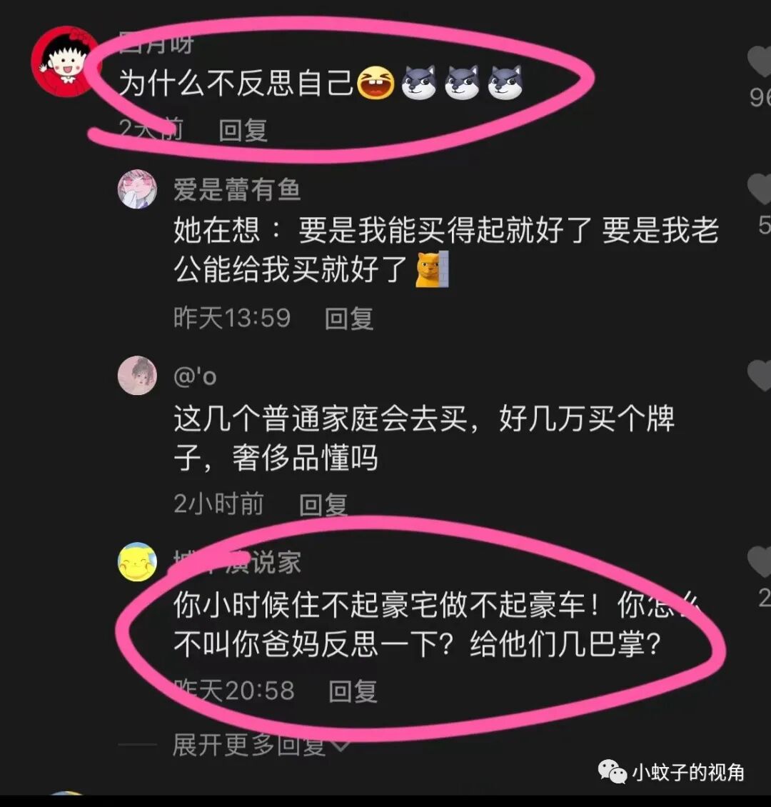也有网友说得更直接:你小时候住不起豪宅、坐不起豪车,你怎么不叫你爸妈反思一下?给他们几巴掌?
