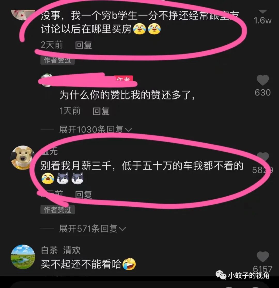 也有网友说:别看我月薪三千,低于五十万的车我都不看。