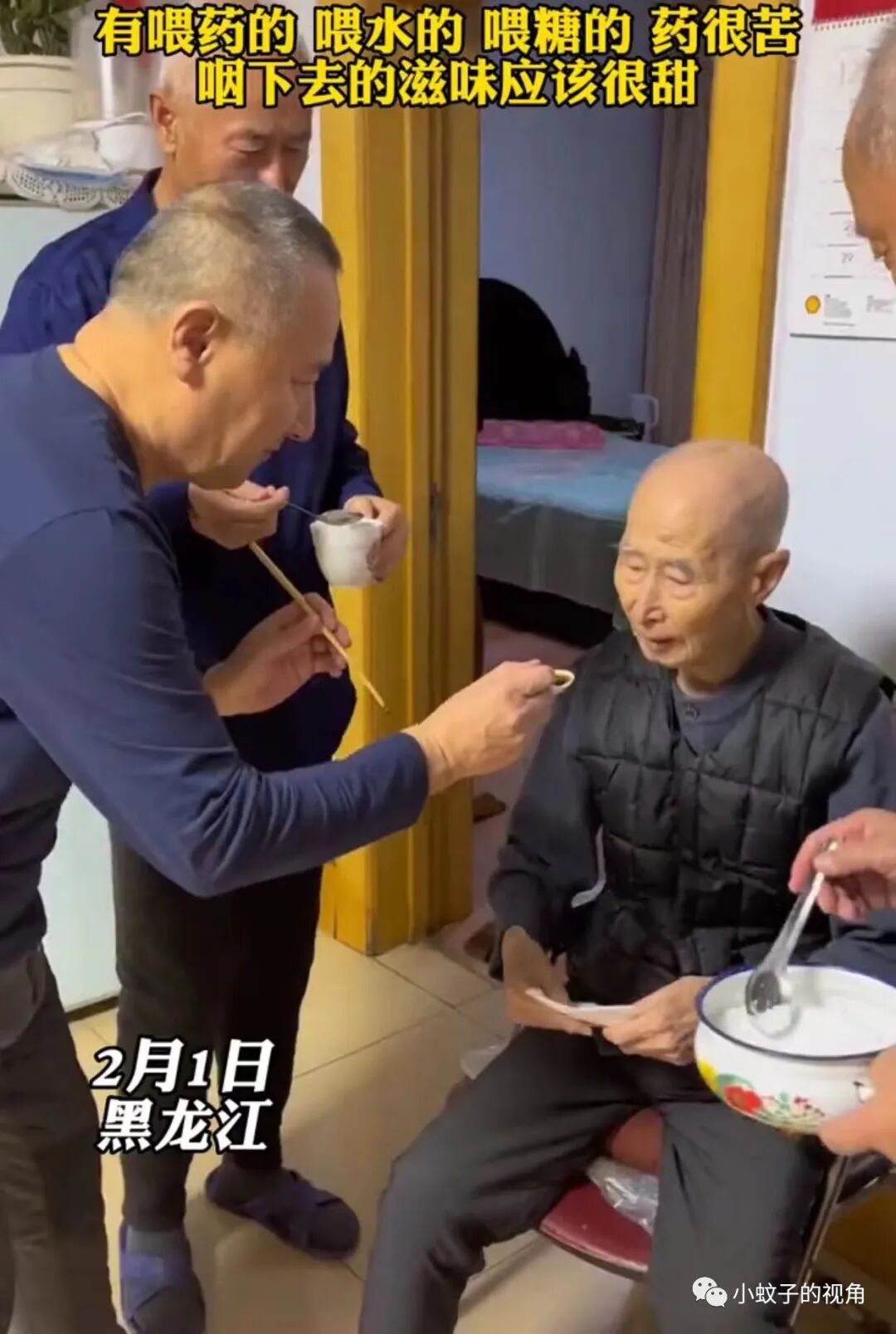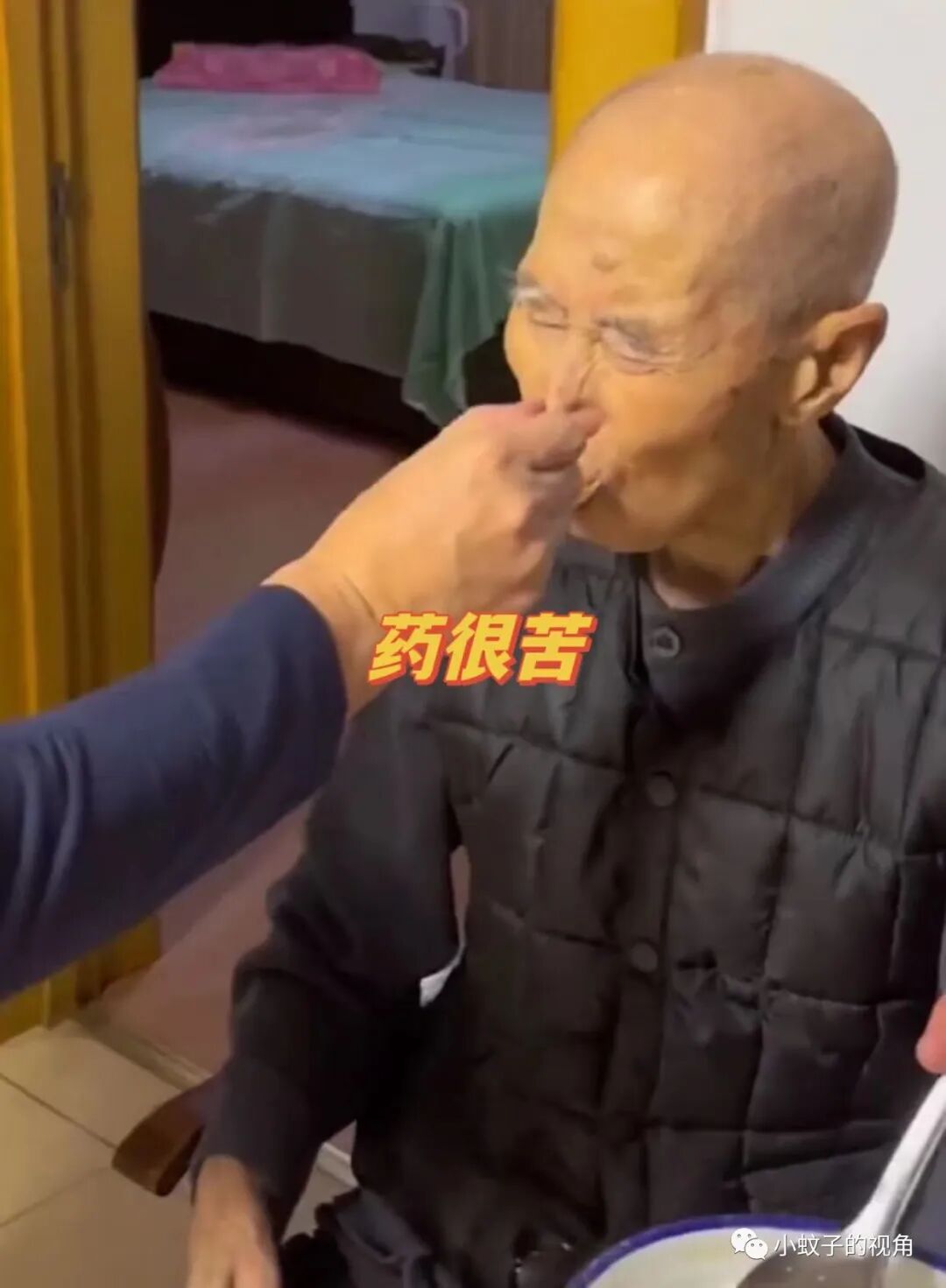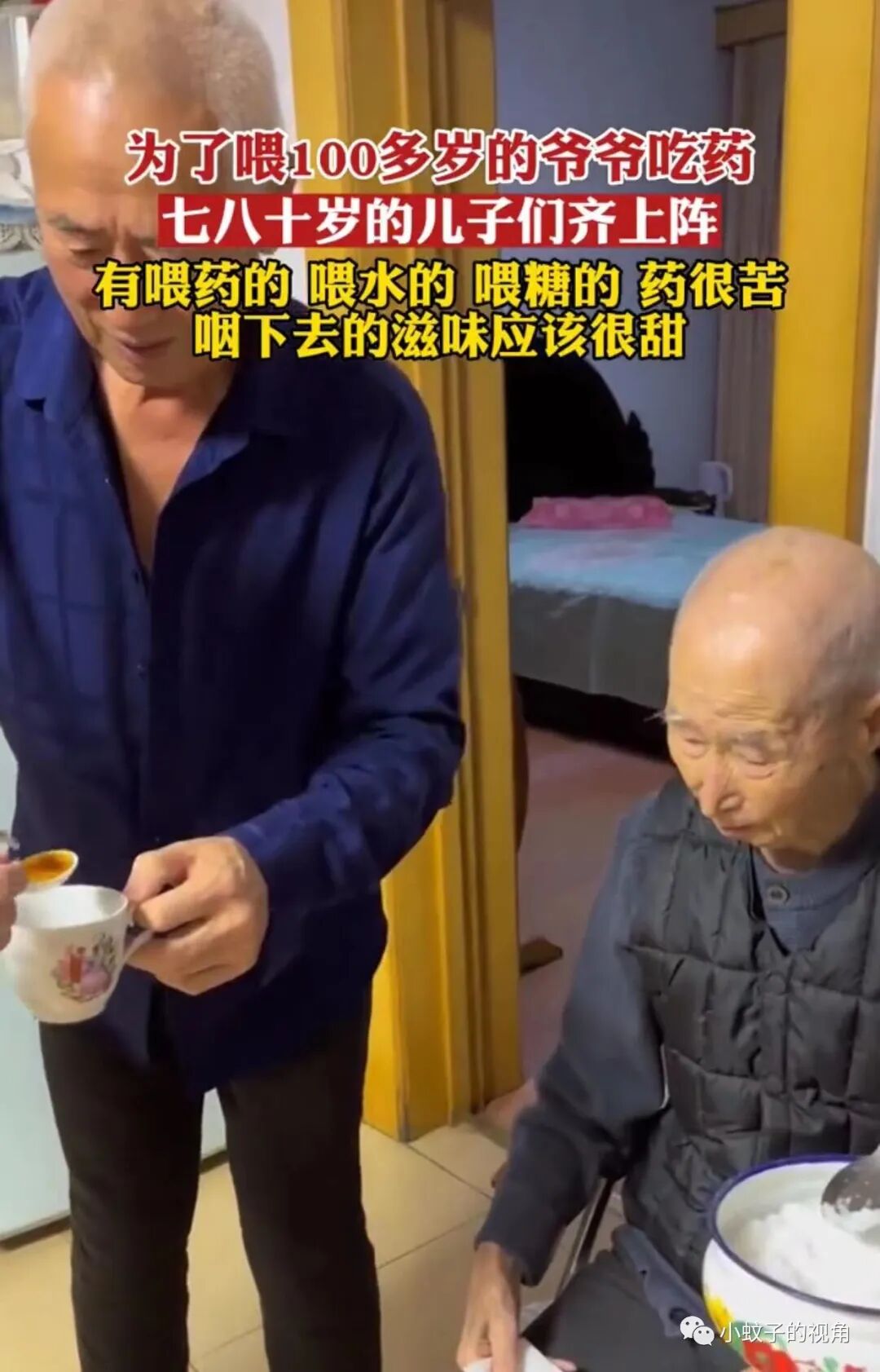 就像这位老人一样,老人病了,为了给老人喂药,三个儿子齐上阵,孙子看了不禁感慨。