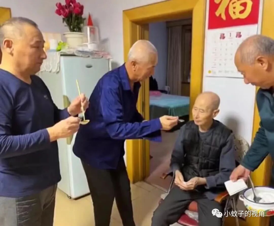 孙子在旁边拍摄,说:爷爷的这几位儿子都已经七八十岁了,都也有了孙辈。现在还能兄弟们聚在一起,就是因为还有爷爷在世。