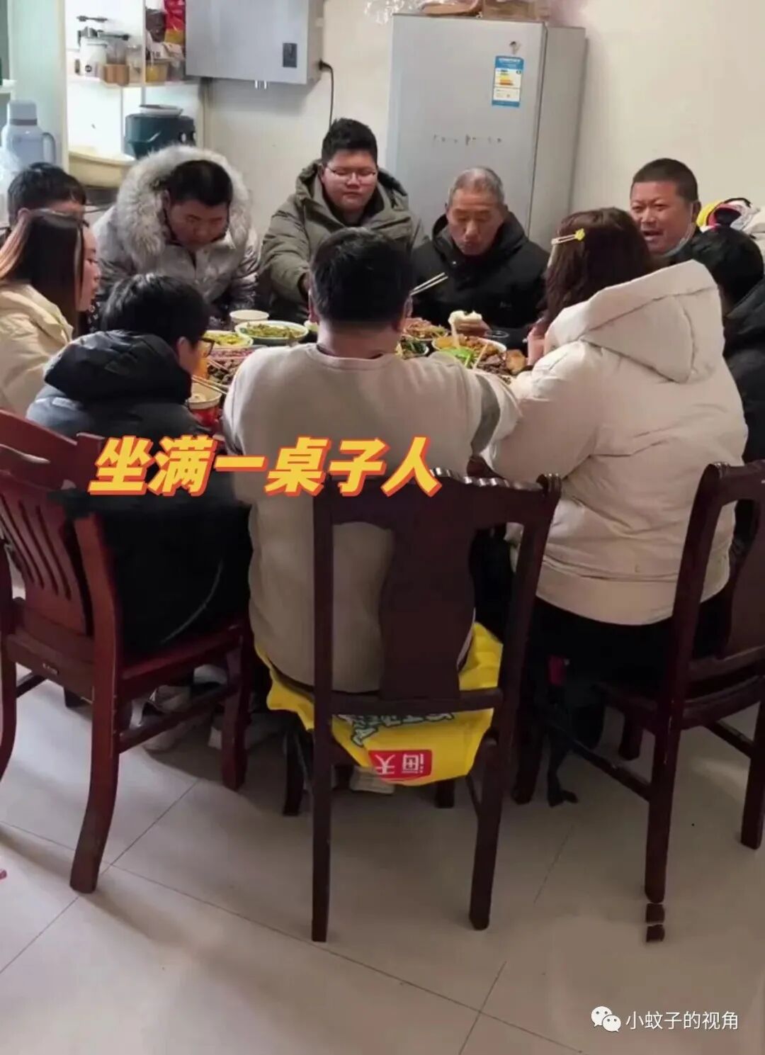 从他发布的资料来看,很明显就是过年的时候孩子都回家团圆了,一张圆桌上坐满了人,人挨着人显得格外拥挤。