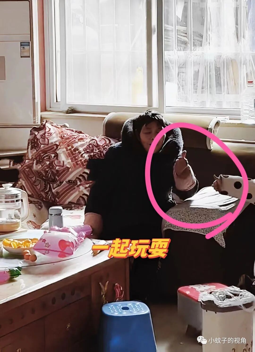 这名女子并没有坐在餐桌上吃饭,而是坐在沙发上,无聊地拿着孩子的气球翻来覆去地看。在她身旁还有一个孩子正在玩耍。