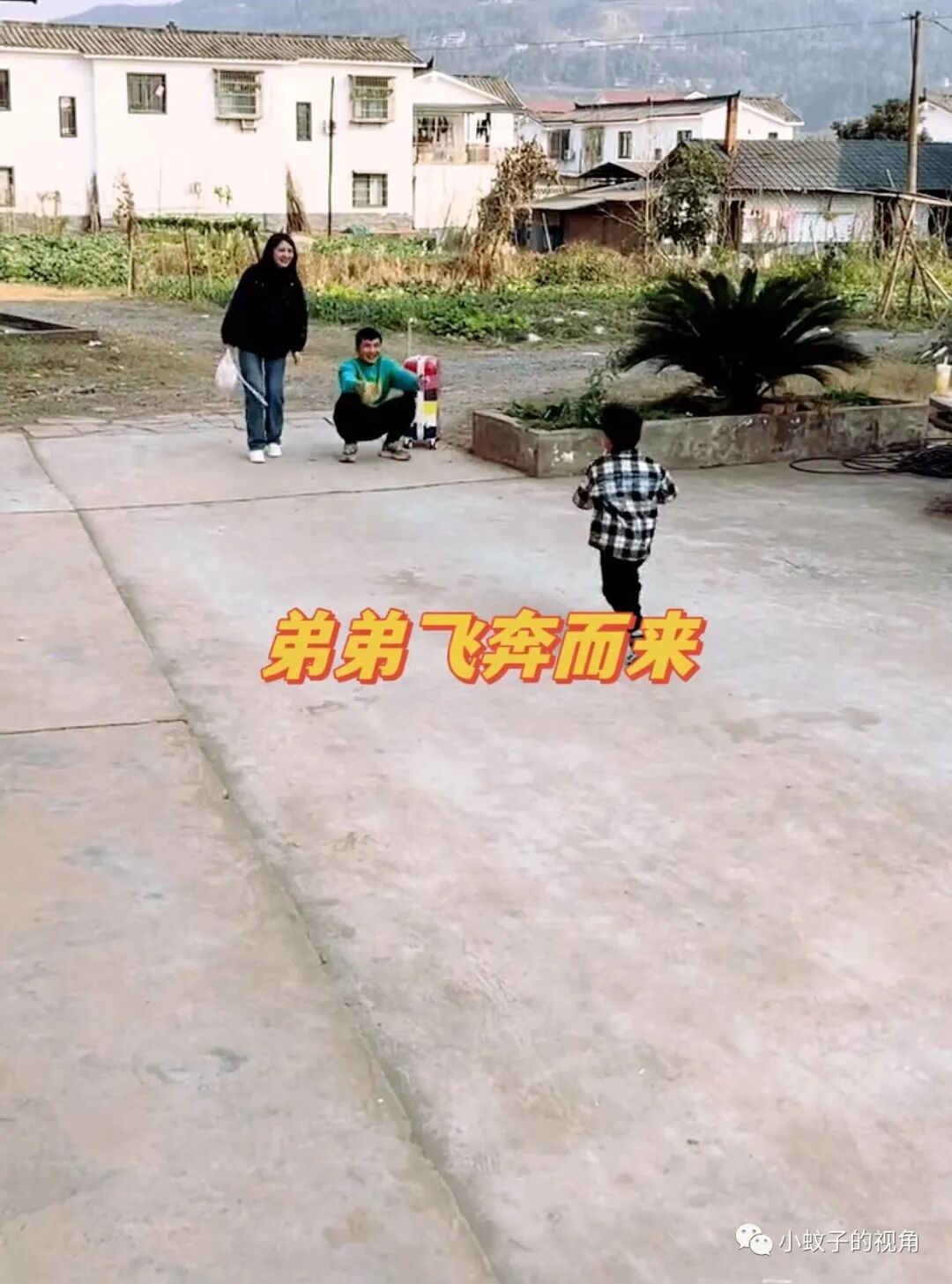 弟弟看到哥哥回来了,立刻挣开父母的怀抱,飞奔着向哥哥跑来,母亲则拿着手机记录这温馨的一幕。