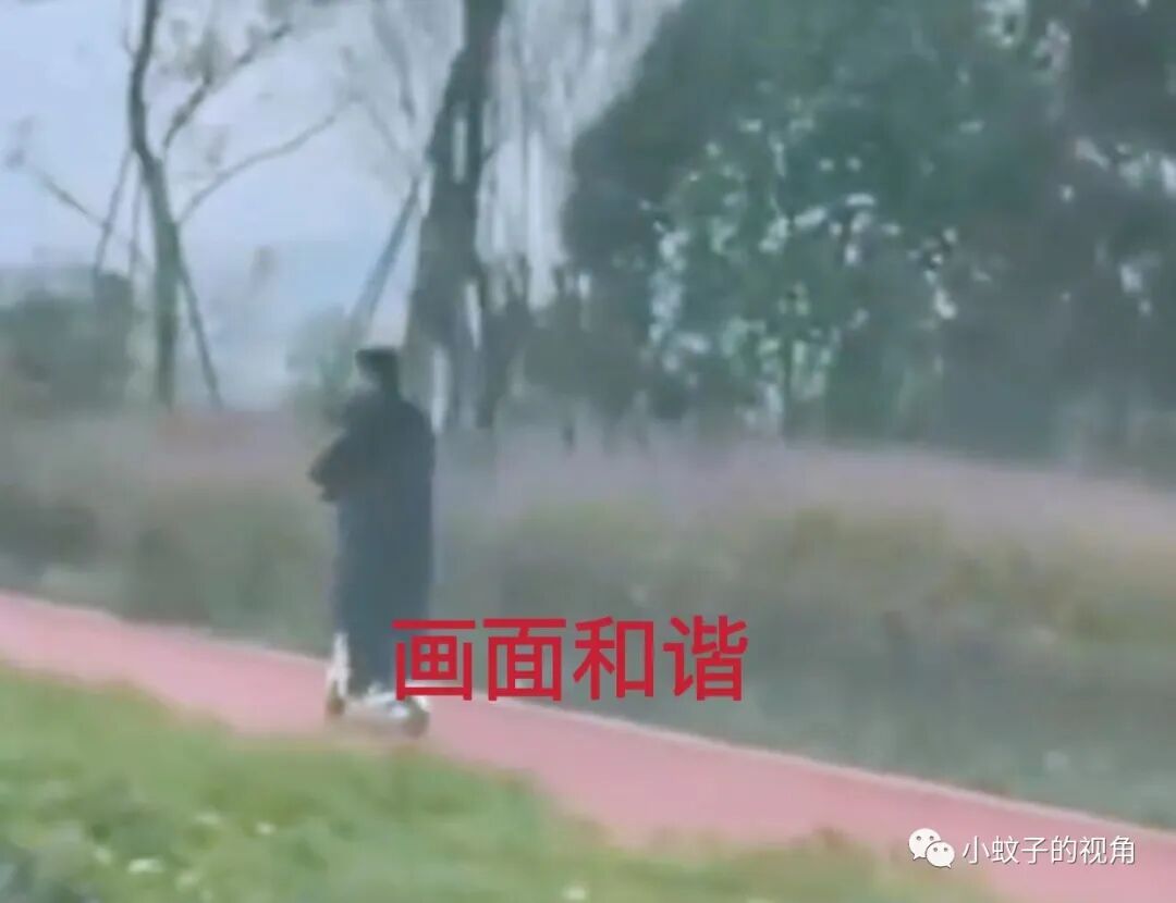 而是从车里拿出一个滑板车,让丈母娘站在滑板车上,想想怕丈母娘站不稳再摔倒,干脆自己也站了上去,把丈母娘护在胸前,带丈母娘兜风。