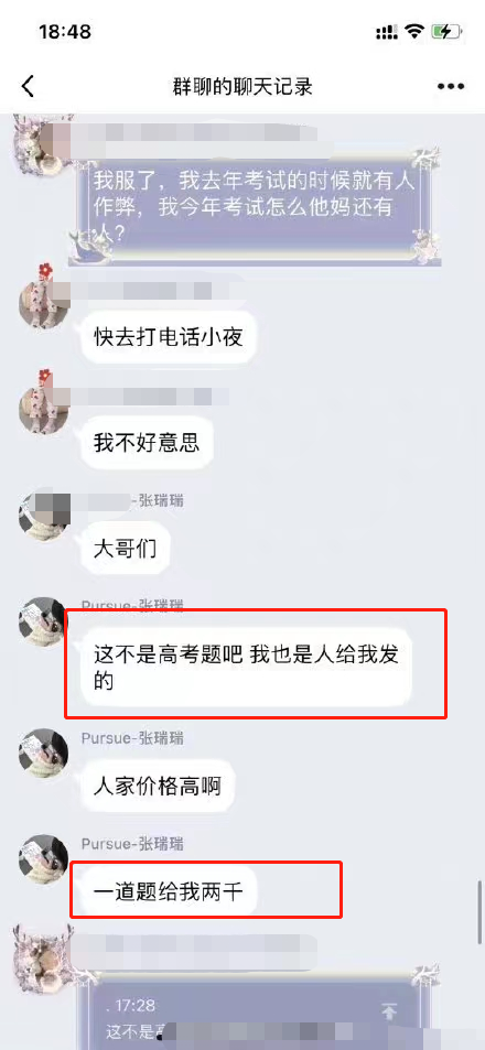 我们简称她“张同学”,张同学在高考的时间里,在群里求高考数学题的答案,她先在3:48分时连发了11条信息,其中有4条是图片,7条是文字信息。