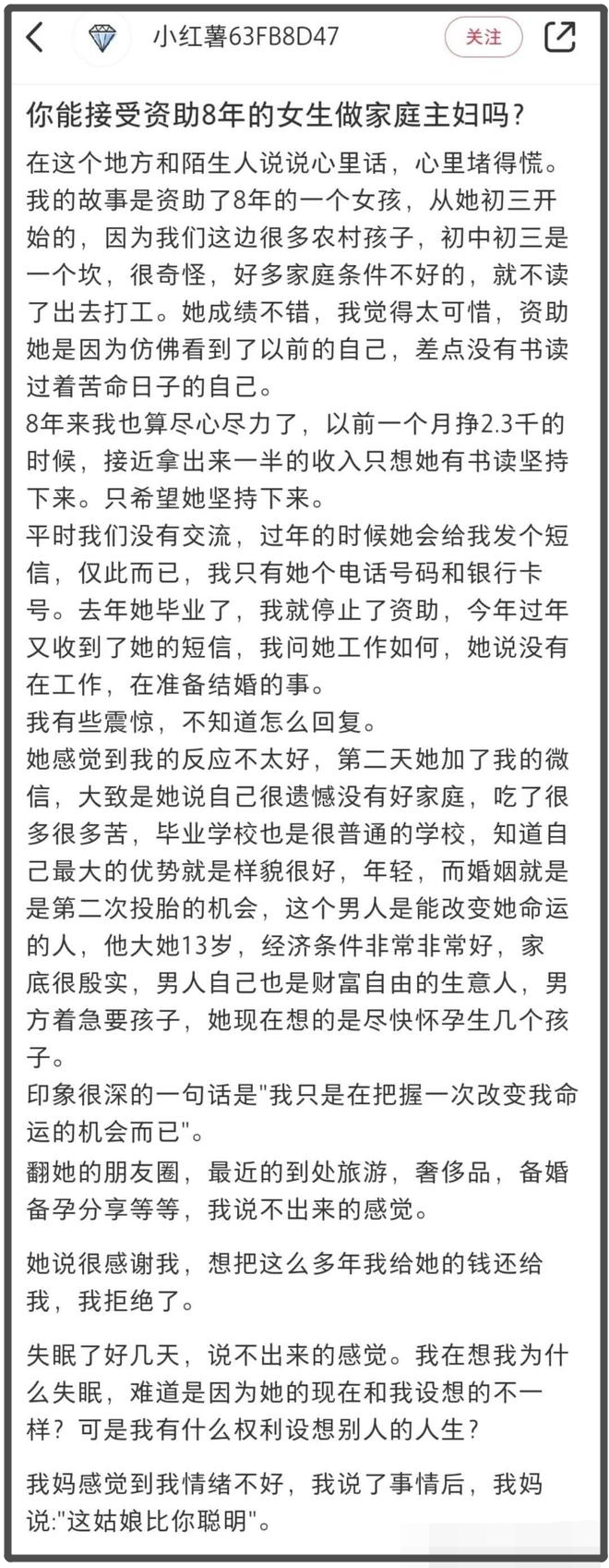 扪心自问,自己资助她8年,就是想让她毕业后嫁人当家庭主妇吗?
