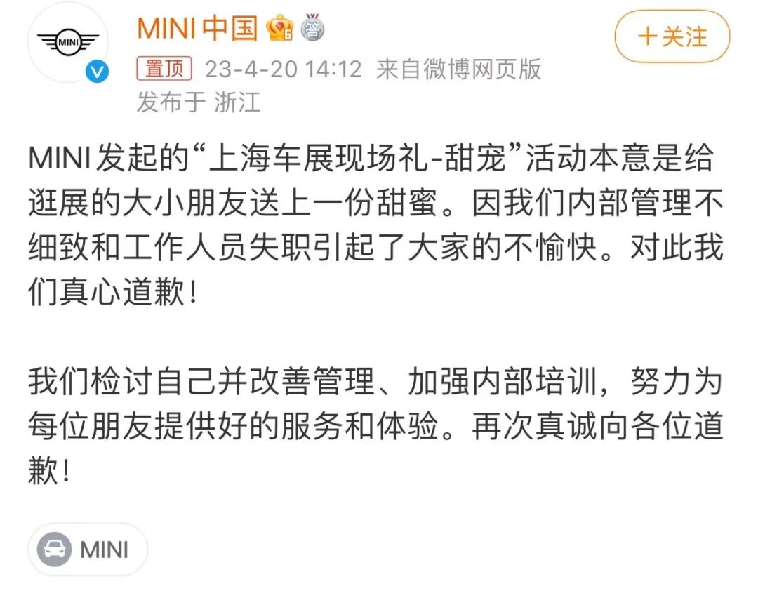 舆论一发酵起来,宝马MINI就怕了,赶紧道歉,他们先把微博上发过的赠送冰淇淋的内容删掉了。