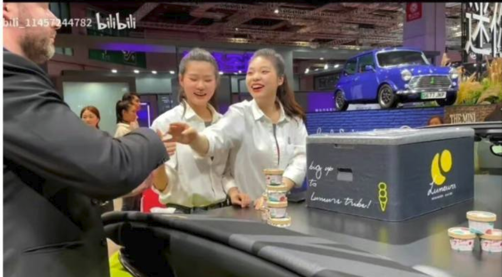 关键是这一幕被一个来参观的汽车博主发现了,他一边拍视频一边过去问,可以免费拿冰淇淋吗?