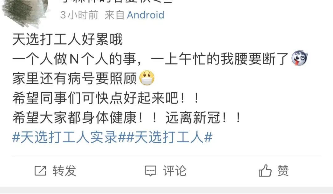 还有更要命的,全办公室都阳了,就他一个人上班,一个人干N个人的活,累得要死要活,拿的还是原来的工资……有的公司因经营困难暂时还不发工资……