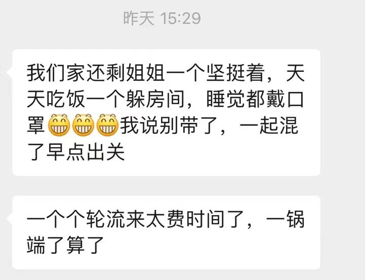 因为全家都阳了,就剩一个,这不是碍事么,所以家人无所顾忌了,巴不得这家伙赶紧阳。