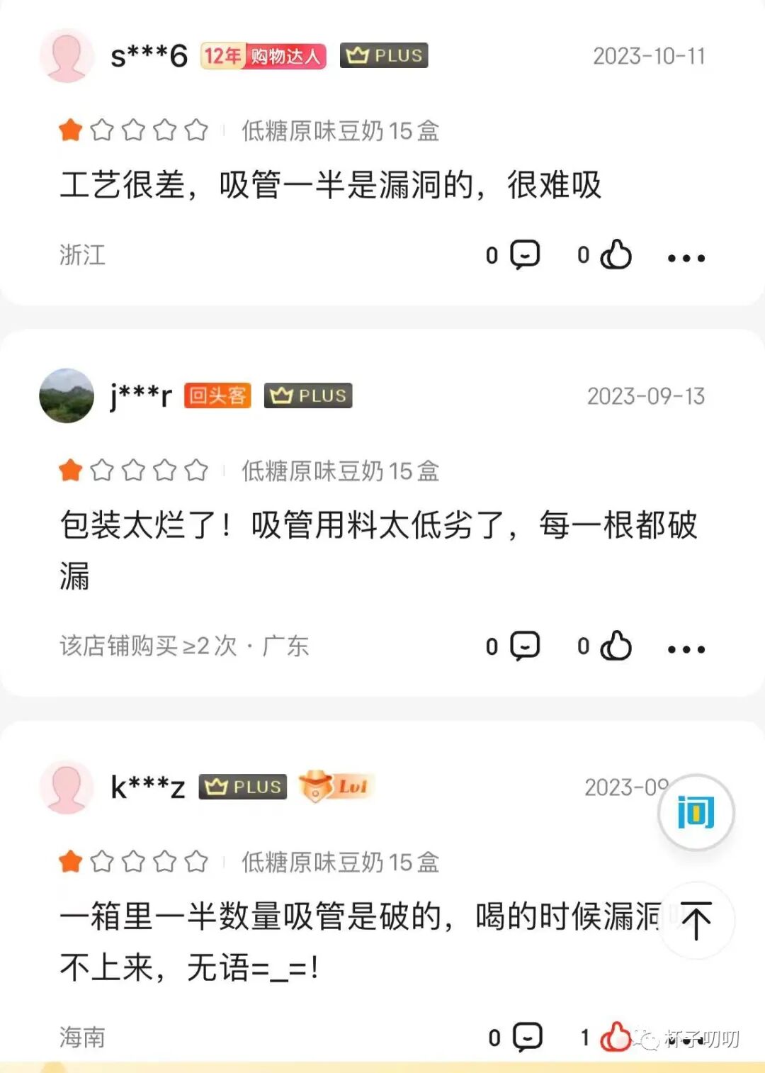 我最近买了两箱某国产品牌的低糖豆奶,喝起来味道还行,但是吸管却大部分都是破的,漏气。