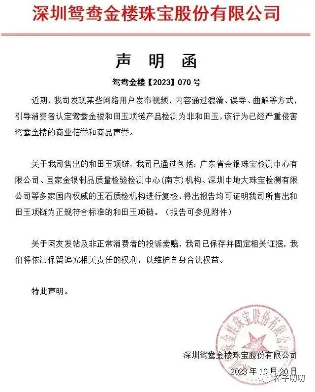 之前,打假人王海说他卖的是假货,李佳琦和厂家“鸳鸯金楼”都拒不承认,说自己卖的产品就是和田玉。
