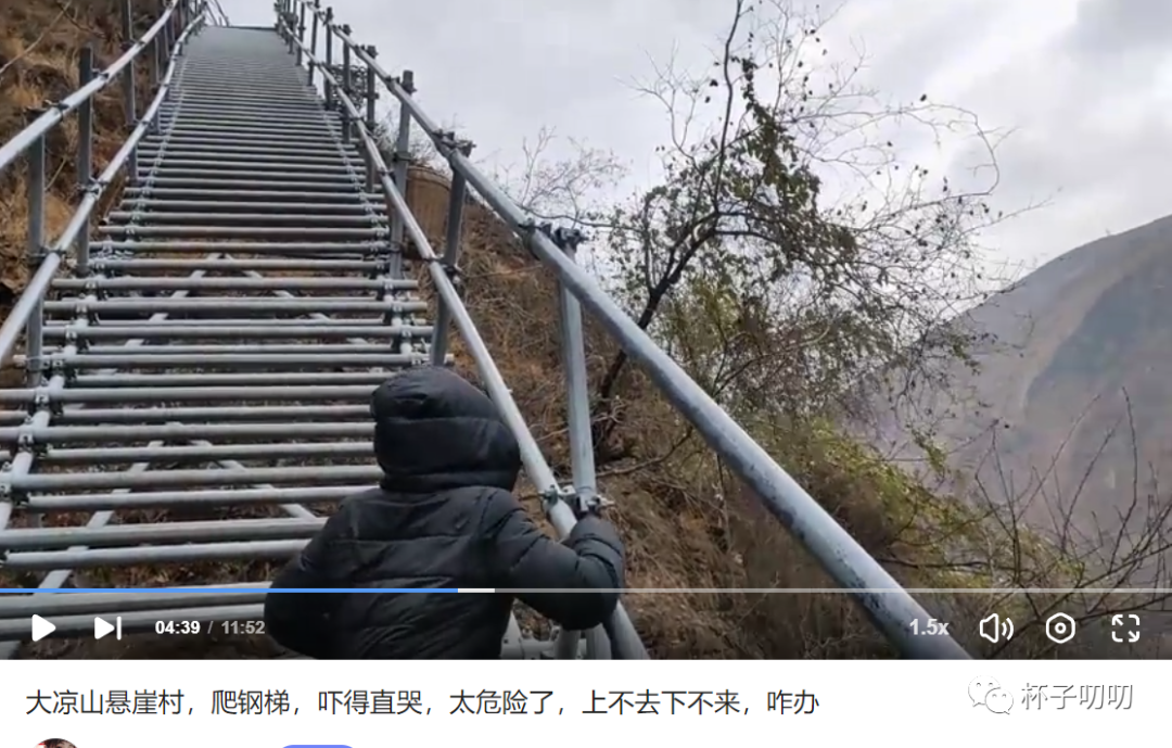 我看到一个视频,要上悬崖村,必须攀爬高800米的悬崖,政府出资给他们修了钢梯,相比他们原来走的木梯能缩短一个小时的路程,但就是这样,也需要爬两个小时。