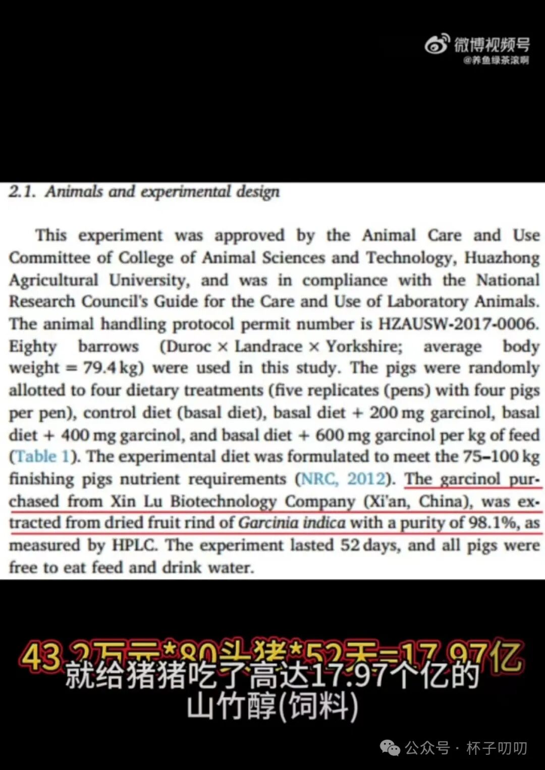 非常不理解的是,他最初的数据从哪儿来的,他真的拿一毫克八百元的山竹醇养猪了吗?一天给猪吃43万块吗?