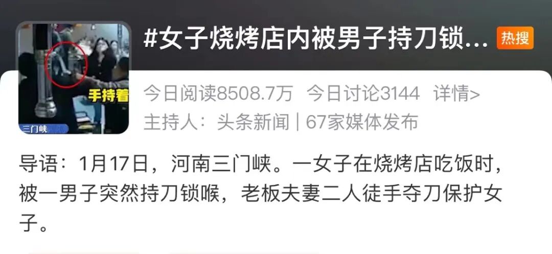 这个热搜的标题是“女子被男子持刀锁喉店老板徒手夺刀,店主:两人可能闹别扭”。