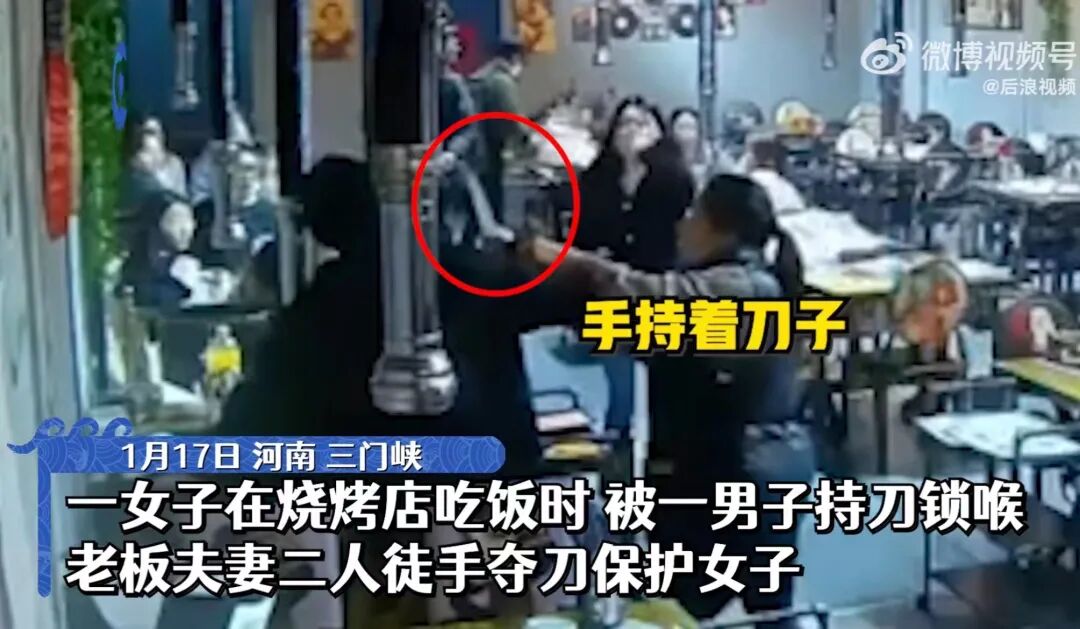 1月17号,河南有一家烧烤店,一个年轻女子和一个男子在吃饭,吃着吃着,不知道怎么了,这男子就突然从包里掏出一把明晃晃的刀,两人动手的过程视频没拍到,但是女子脖子上有了划痕。