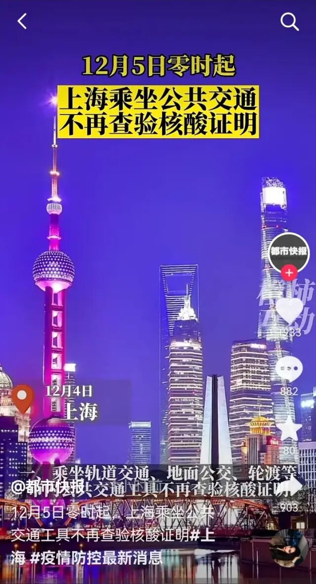 12月4日,魔都上海也加入“群聊”!吃螃蟹的这个桌上,已经云集了北上广深,这四位最有影响力的人物。沪上12月4日振臂一呼:零时起,乘坐公交不再查验核酸。