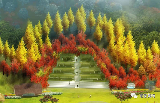 从山底大片草坪起步,以中间三米宽山坡阶梯为主轴,两边各有四个对称