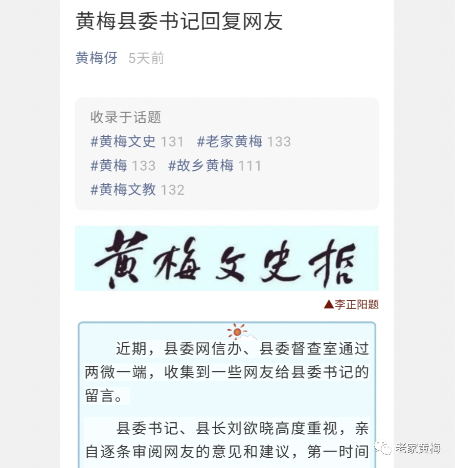 7月15日我在微信上看到《黄梅县委书记回复网友》一文。从中我了解到新任县委书记刘欲晓同志高度重视网民对政府部门提的工作建议和反映一些涉及民生福祉的意见,走网上群众路线,做到网上听民声,网下办实事,认真听取网民的意见和建议,切实维护广大人民群众的合法权益;希望广大网民一如既“网”关心家乡,支持家乡,线上线下携手共进,共创黄梅美好未来。