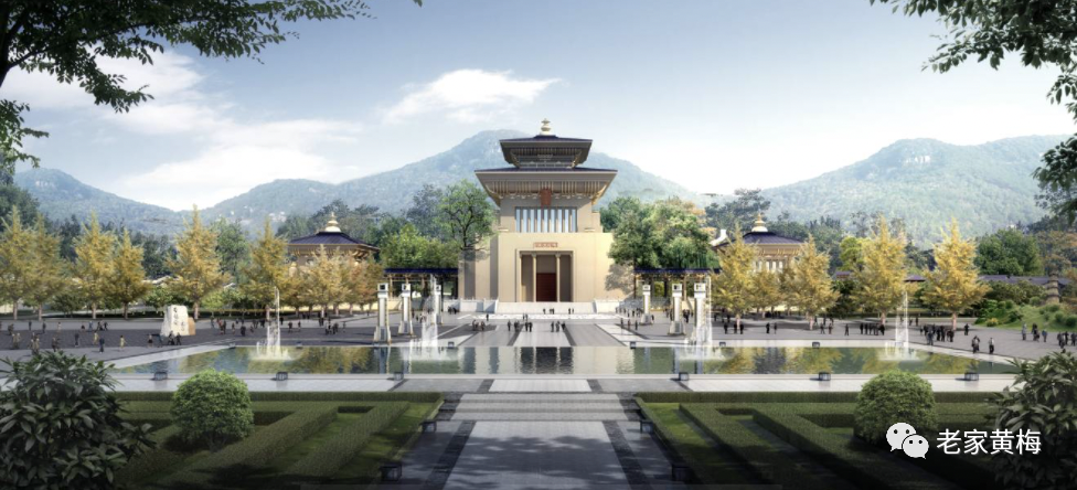 古道西边,大型禅宗文化广场,广场中间布满了浅浅的池水,在阳光下波光粼粼。在广场的上方是禅宗艺术博物馆、禅宗名人公馆等三座佛教建筑在阳光下熠熠生辉。