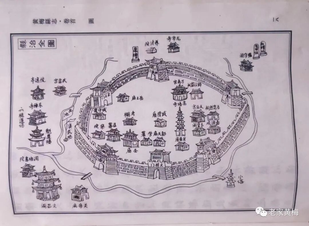 看古城全图,首先是护城河把全城围得严严实实。史料显示城开始是土城,于明洪武年间所筑,有谯楼。明万历二十二年,湖广巡抚郭惟贤题请建石城,历四年竣工,设六门。东为仁育门,北为拱辰门,西为正义门,南为文明门,西南之间为化龙门即无衢门,东南之间为便民门即小南门,各门均建有谯楼。至光绪时,城墙周长五里二百四十二步,高二丈五尺,上宽九尺,底宽一丈五尺左右。垛口三千七百五十个。梅城原本无池,明季末,整濠环城以为池。除北门外,城东北,西北各掘濠一道,深阔各丈余。古黄梅城南持河为险阻,西掘塘濠,潴水环廓,为鄂东较坚固的一座古城池。如今城墙已毁,濠池被填,原来的老圈子早已被城市发展突破,但城墙的位置还依稀可辨,现在的环城路基本是古城墙的位置。