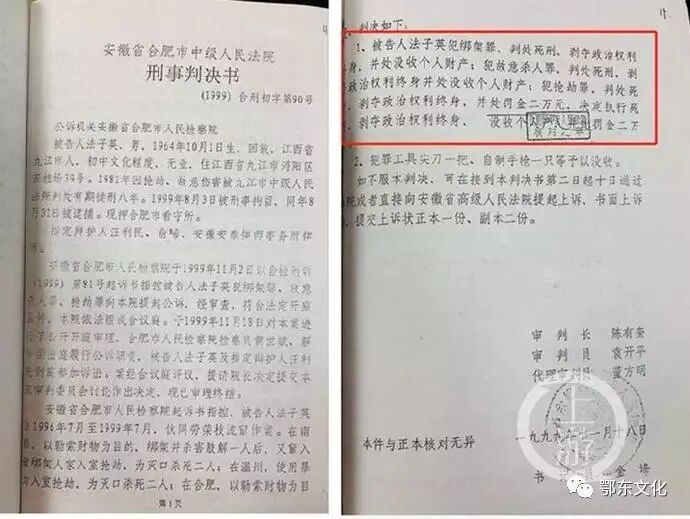 1999年11月18日,合肥市中级人民法院对法子英作出的刑事判决书,数罪并罚判处死刑。如今,20多年前轰动一时的大案终于画上句号,愿逝者安息!