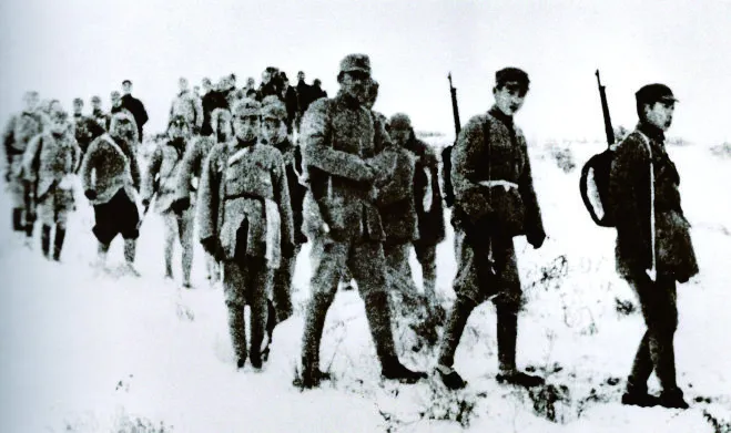 ▲1939年初,李先念率领新四军在豫鄂边区开展敌后游击战争。图为独立游击大队一部在雪地行军。