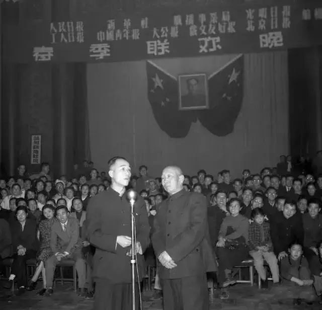 1956年春节,《人民日报》、新华社、广播事业局、《光明日报》、《工人日报》、《中国青年报》、《大公报》、《俄文友好报》、《北京日报》编辑部联合举办联欢会。图为相声演员侯宝林、郭启儒在晚会上表演相声。