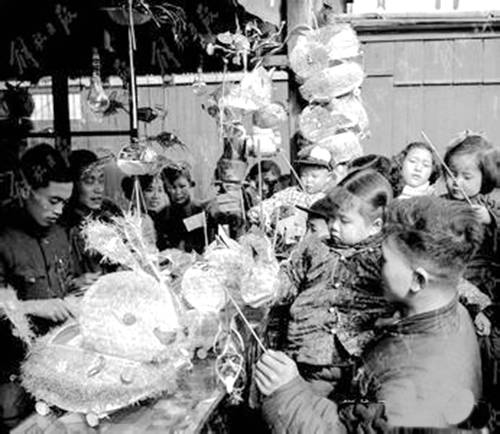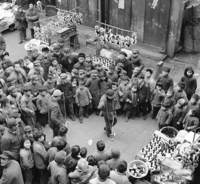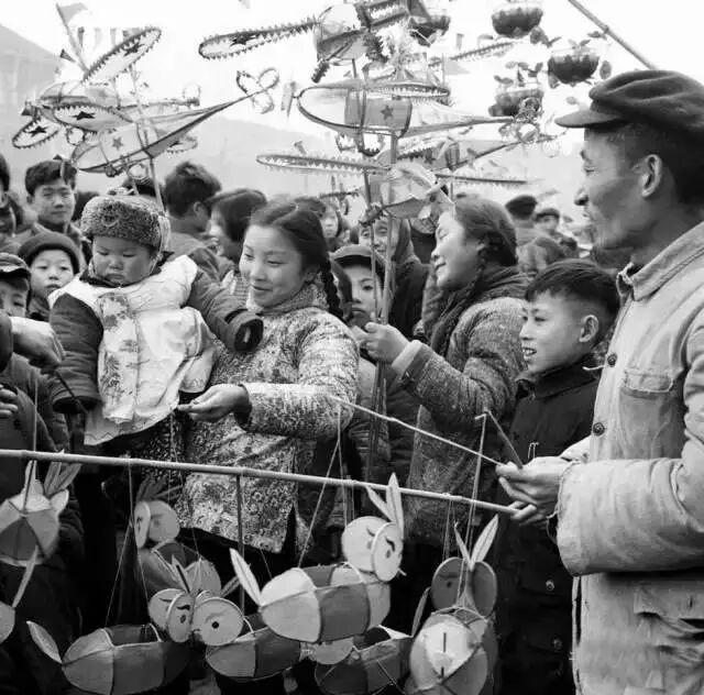 1957年春节期间的上海街头。扯铃摊上发出一片嗡嗡声,吸引了不少小顾客。