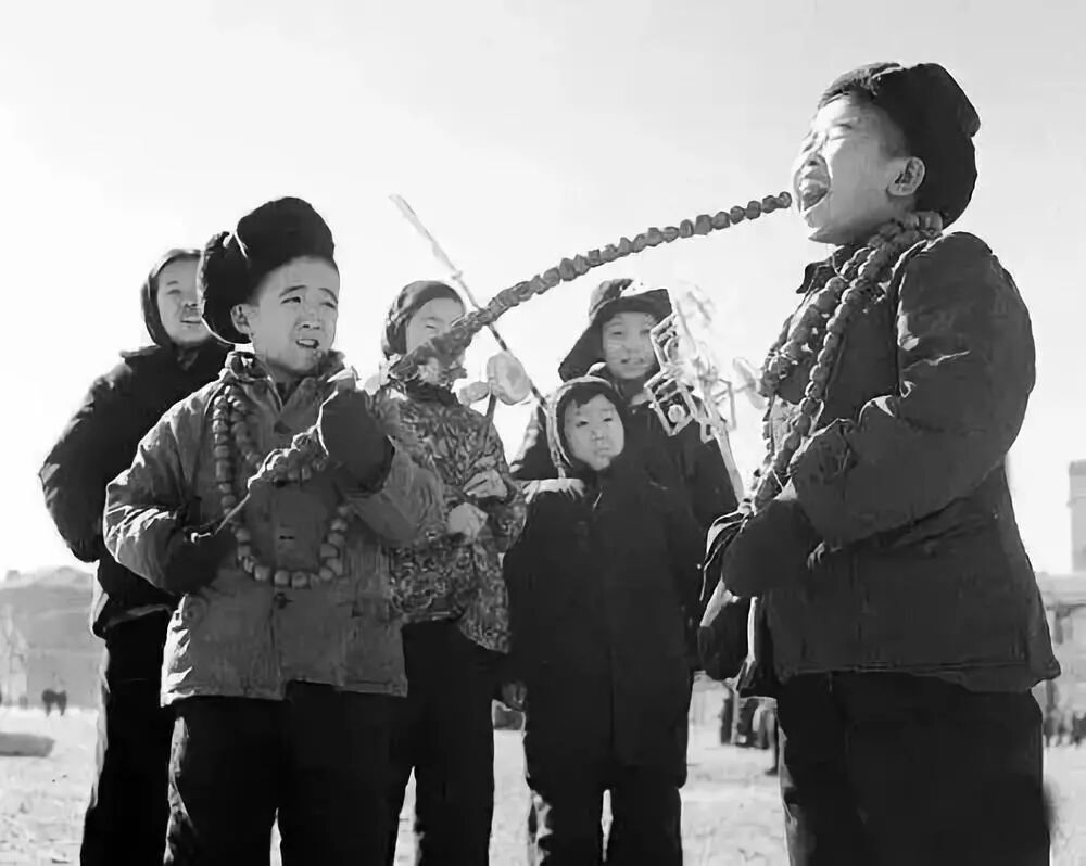 1961年春节,北京逛厂甸庙会的孩子们最感兴趣的是大串糖葫芦。