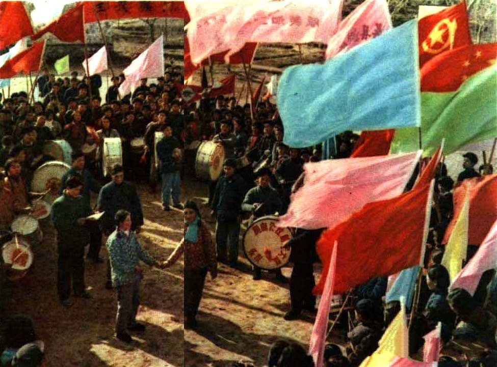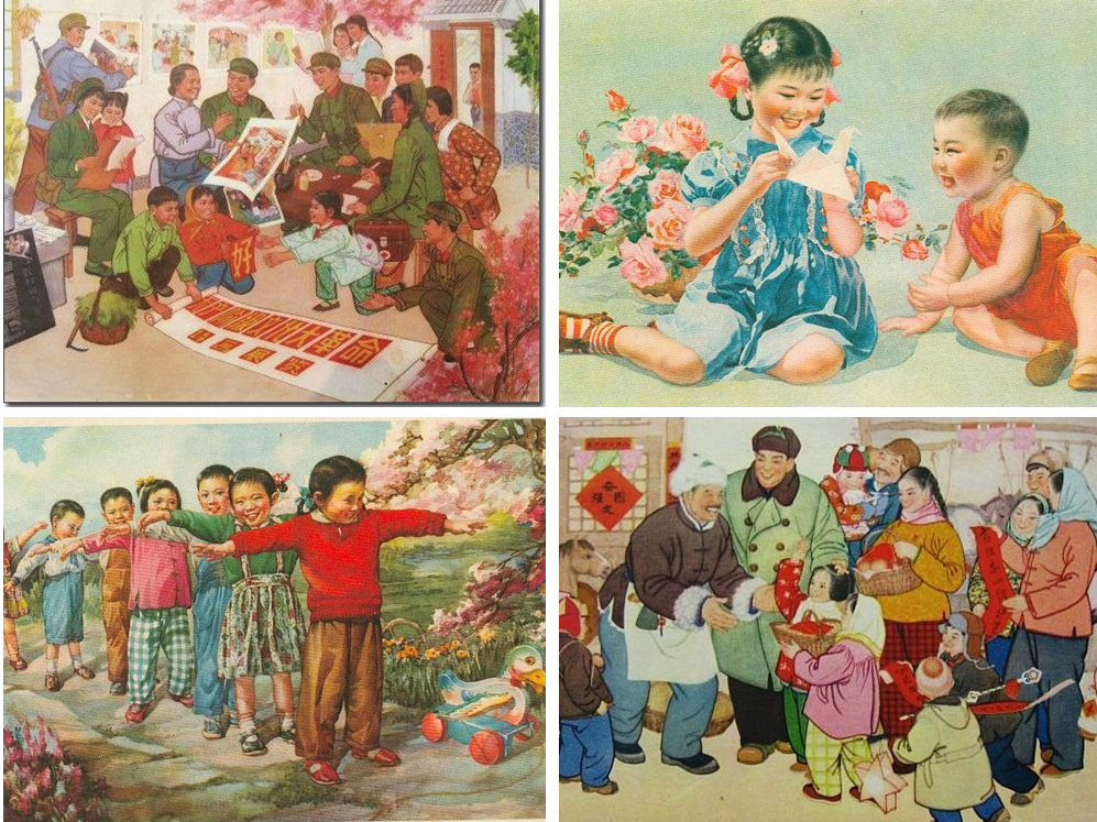 60年代初过春节,典型的景象是:各生产队的大街小巷都被打扫得干干净净,家家户户贴上新春联,挂起毛主席像,大街上吊挂着五颜六色的标语,看上去一派热闹景象。
