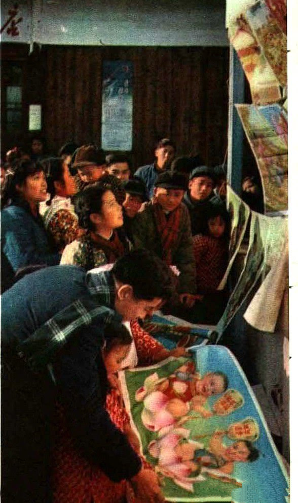 1956年春节前夕,四川双流县彭镇供销合作社的流动推销小组把大批年画及文具用品送到农村。这是彭镇乡第一高级农业社的社员们正在购买年画。