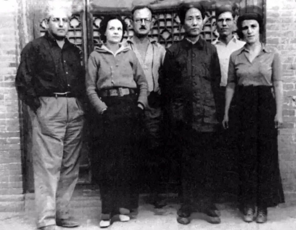 1937年,毕森(右二)一行和毛泽东合影留念。(来源:《1937,延安对话》)