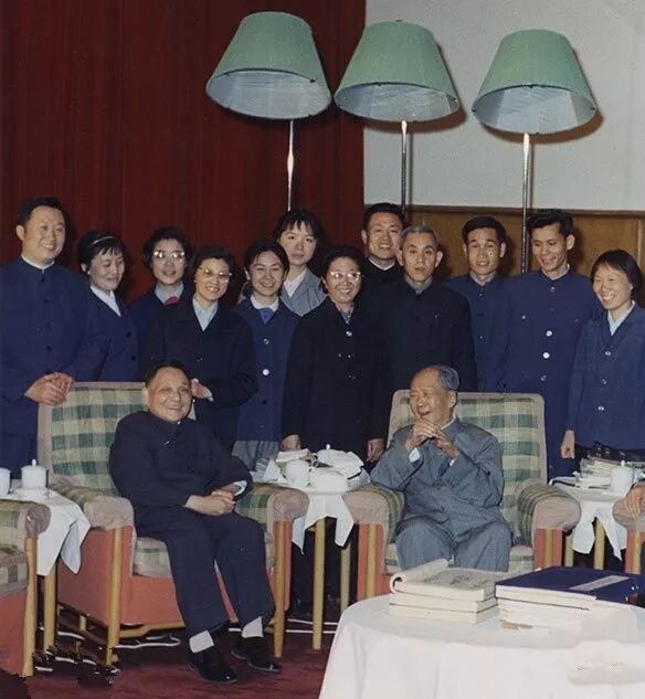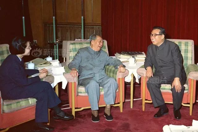 1975年4月18日,毛泽东会见金日成,左一是外交部副部长王海容。邓小平是陪同会见的惟一的中国领导人。在这次会见上,毛泽东跟金日成说自己身体不行了,“上帝请我喝烧酒”,并说“我不谈政治,由他来跟你谈了。此人叫邓小平。”
