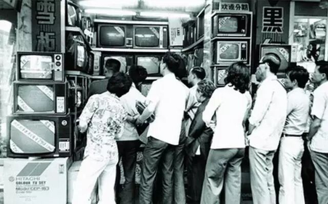 1976年9月,香港市民在商场外通过电视转播收听毛泽东逝世的消息。
